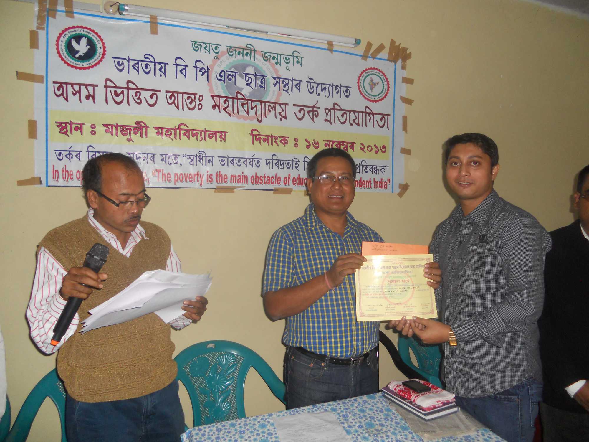Dr Sashi Kanta Saikia At State Based Inter-College Debate Competition Organized By Majuli college November 16, 2013 / By Sashi Kanta Saikia Share This Post Dr Sashi Kanta Saikia Attended State Based Inter-College Debate Competition Organized by Majuli College in association with All Assam BPL Student Union Share This Post